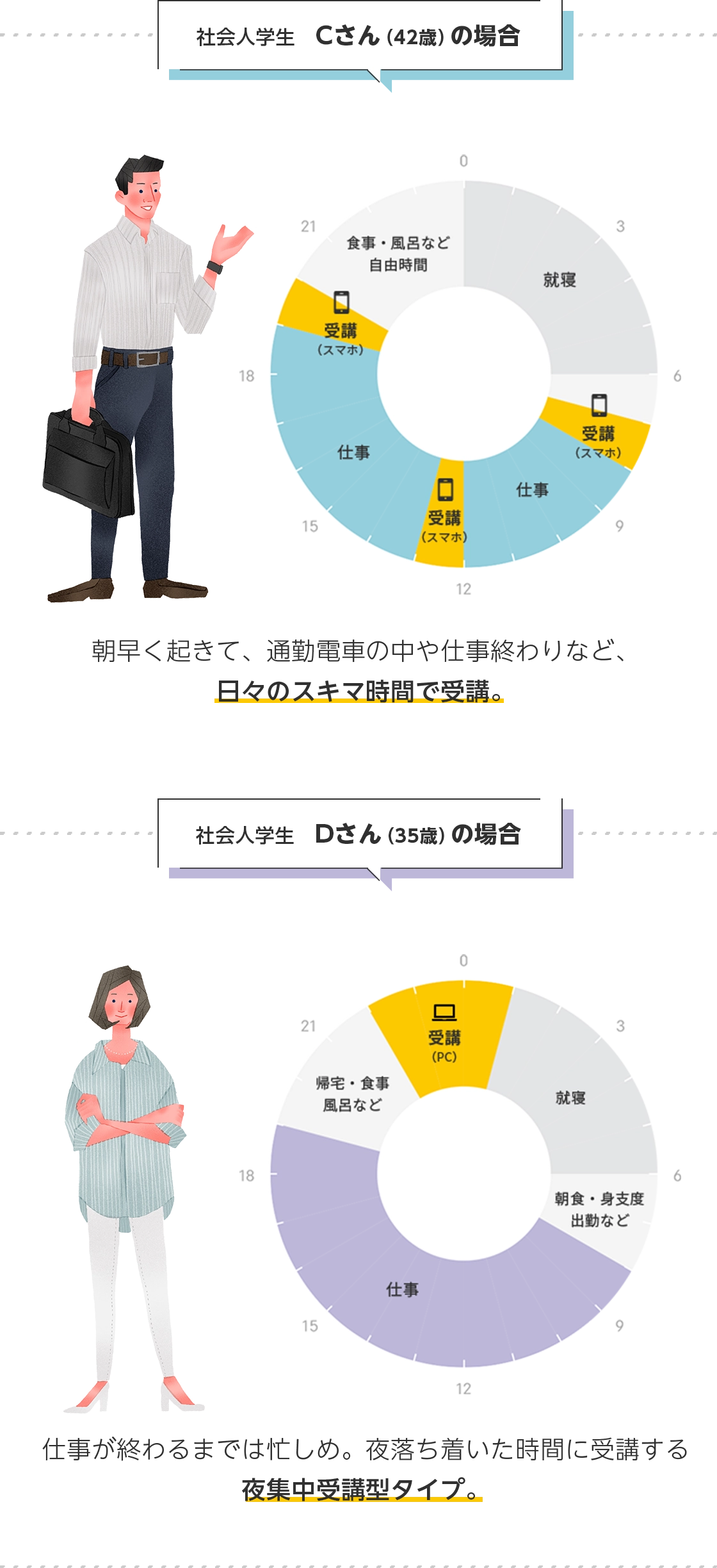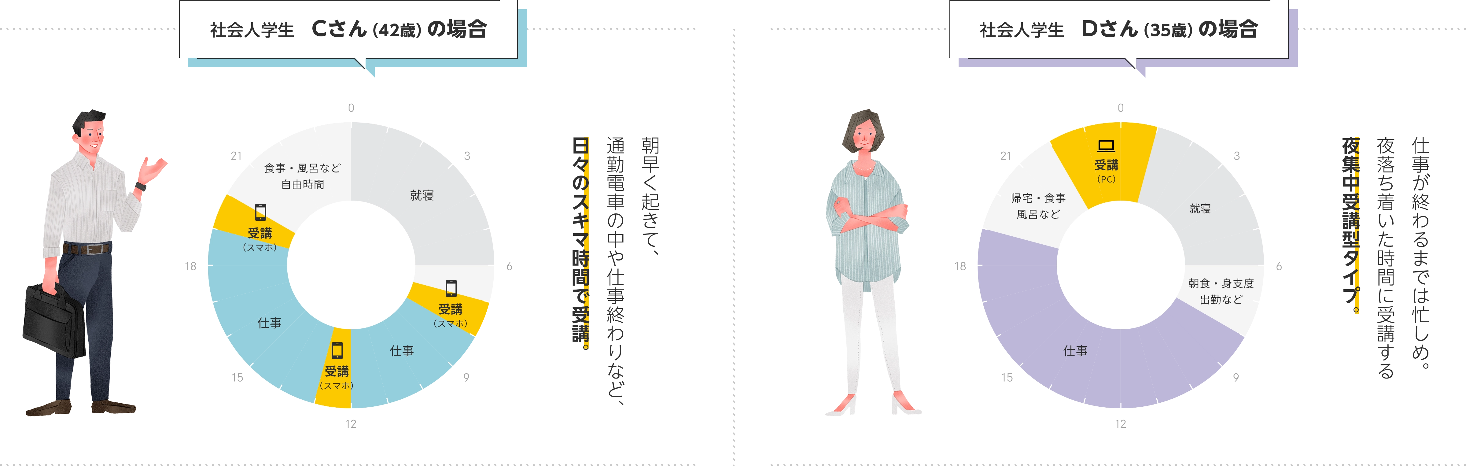 サイバー大学の学生は、フルオンラインでいつでも・どこからでも学べるという特長を活かしながら、自身のライフスタイルや都合に合わせて自由なキャンパスライフを自身でデザインしています。