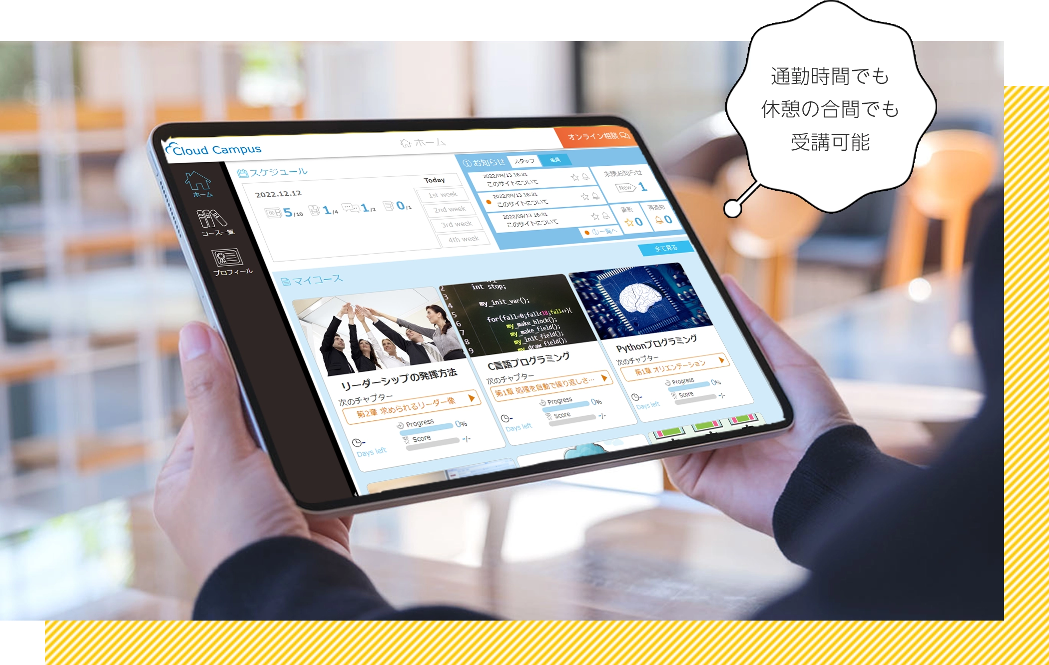 時間にとらわれることなく、あなたのライフスタイルに合わせて、いつでも好きなときに、無理のない受講スケジュールを組み立てることが可能です。